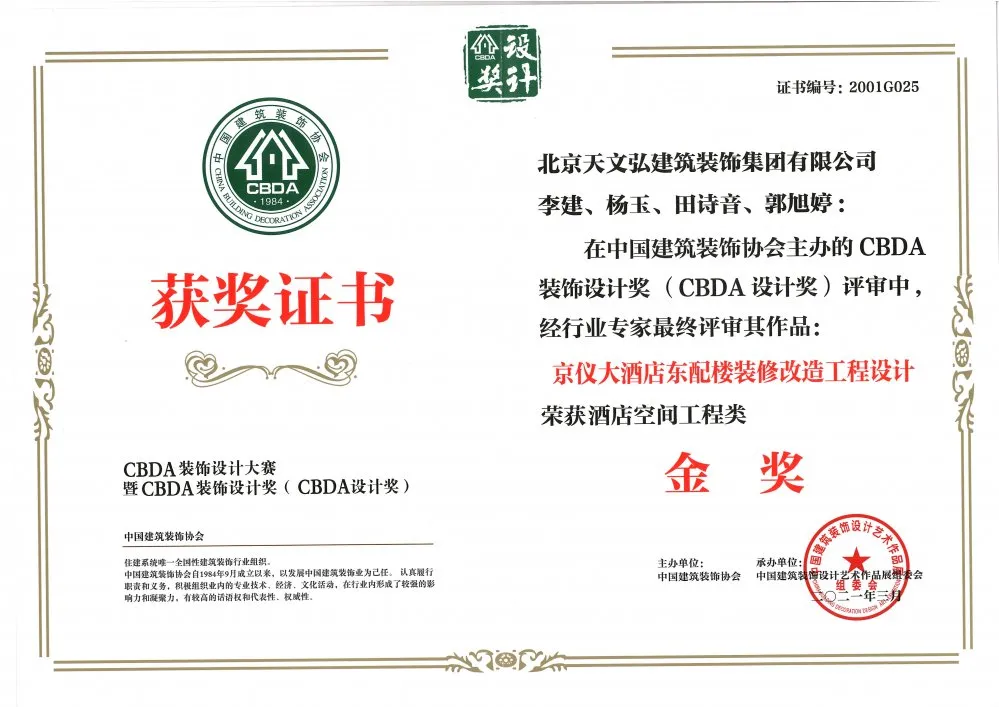 恭喜我司設(shè)計(jì)團(tuán)隊(duì)在中國(guó)建筑裝飾協(xié)會(huì)主辦的 CBDA裝飾設(shè)計(jì)獎(jiǎng)評(píng)審中,經(jīng)行業(yè)專家最終評(píng)審其作品“京儀大酒店?yáng)|配樓裝修改造工程設(shè)計(jì)”榮獲酒店空間工程類金獎(jiǎng)。